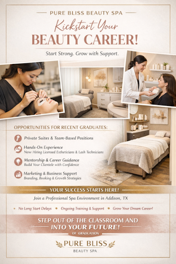 Pure Bliss Beauty Spa is a professional beauty and aesthetic spa located in Addison, Texas, committed to supporting beauty school students and newly licensed professionals as they transition from graduation into the professional beauty industry.